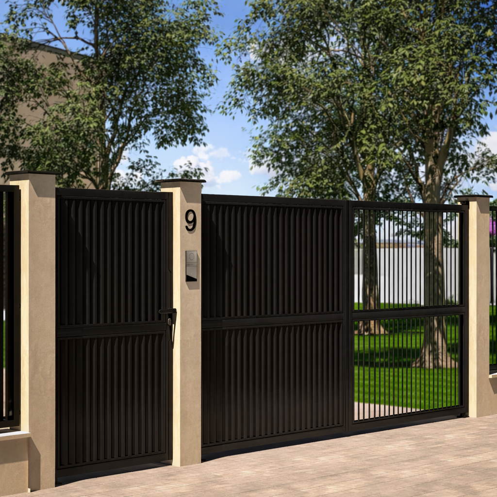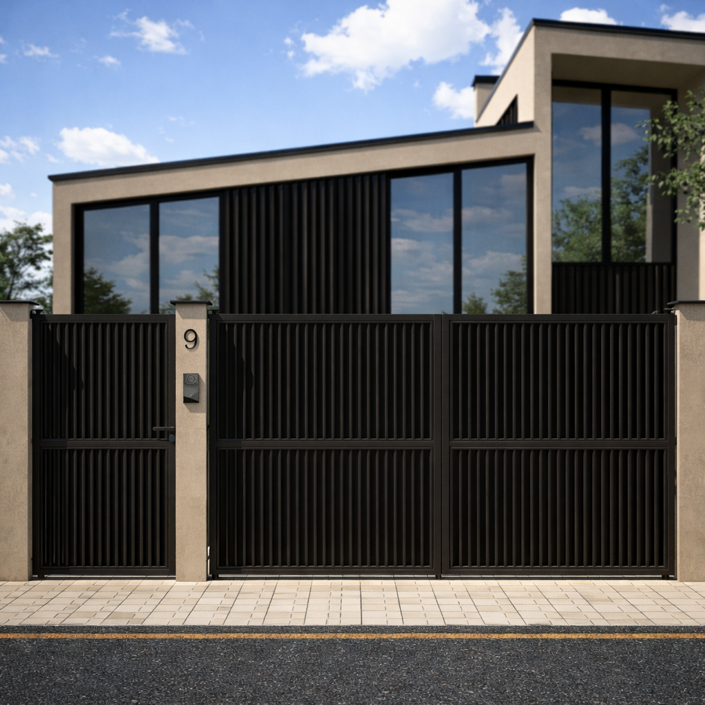 Porti Batante pentru Acces Auto + Pietonal Tip Jaluzea Lamele Verticale din oțel sau aluminiu