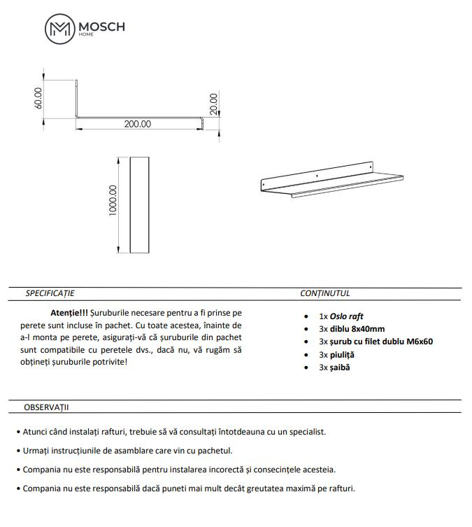 Colecția este formată din 5 piese cu lungimi diferite,5 rafturi metalice din aluminiu perfect gandite, cu  adâncimea de 20 cm, oferind flexibilitate și libertate în compoziție. Fie că alegi raftul de 100 cm lungime, sau creezi o structură modulară, Oslo se adaptează cu ușurință.